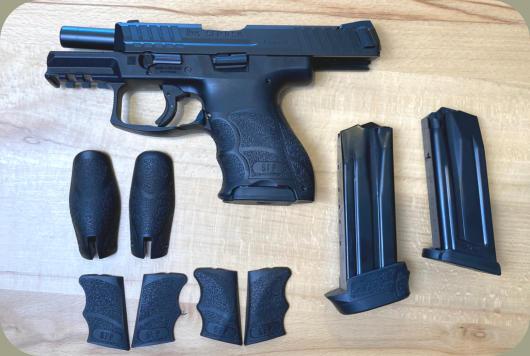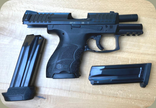 Selbstladepistole Heckler & Koch SFP9SK (Sub-Kompakt): Der Zwerg der SFP9-Serie! Mit starr verriegeltem, modifizierten Browning-System und Single-Action Abzug. Die Demontage der Pistole erfolgt werkzeuglos. Durch tauschbare Griffschalen und Griffrücken ergeben sich verschiedene Kombinationsmöglichkeiten zur individuellen Gestaltung des Griffstücks und dadurch optimale Anpassung an alle Handgrößen. Exzellente Abzugscharakteristik und höchste Präzision bei schnellen Schussfolgen. Beidseitige Magazinauslöse- und Verschlussfanghebel für Rechts- als auch Linkshänder. Mit Abzugs-, Schlagbolzen- und Demontagesicherung und kaltgehämmertem Polygonlauf aus hochfestem Spezial-Stahl. Lauflänge 86 mm (3,38“). Schnelle Zielerfassung durch nachleuchtende Visierung. Das Durchladen wird durch seitliche Nocken erleichtert! 3 Magazine, davon 1 mit Verlängerung Hauspreis: €850,00